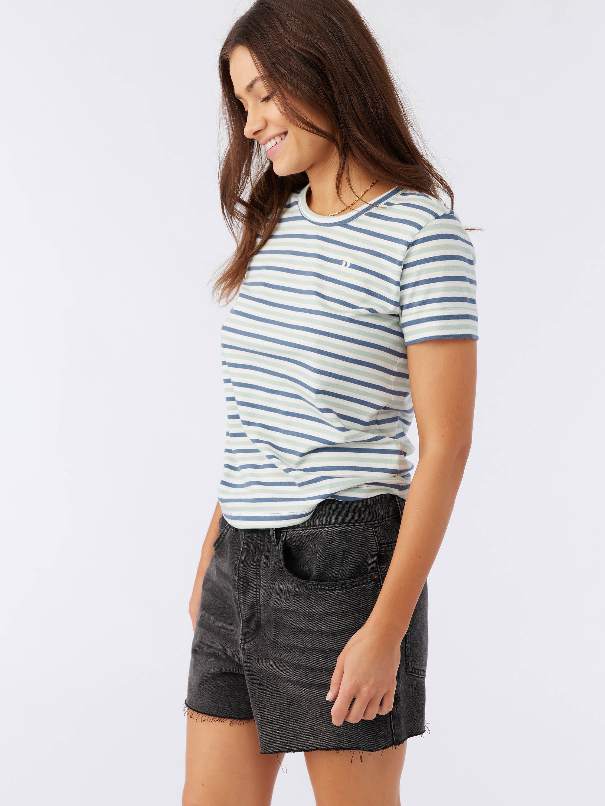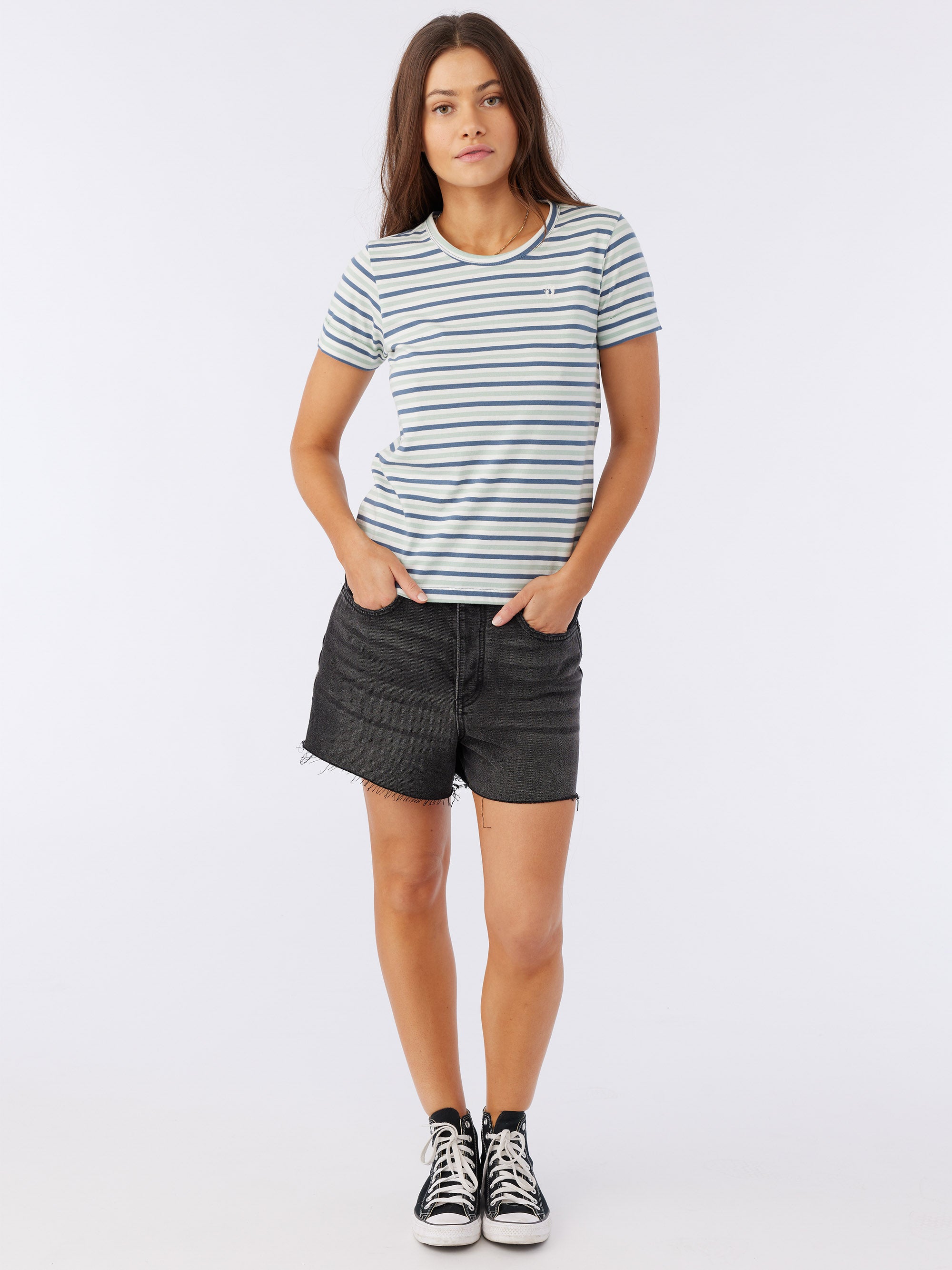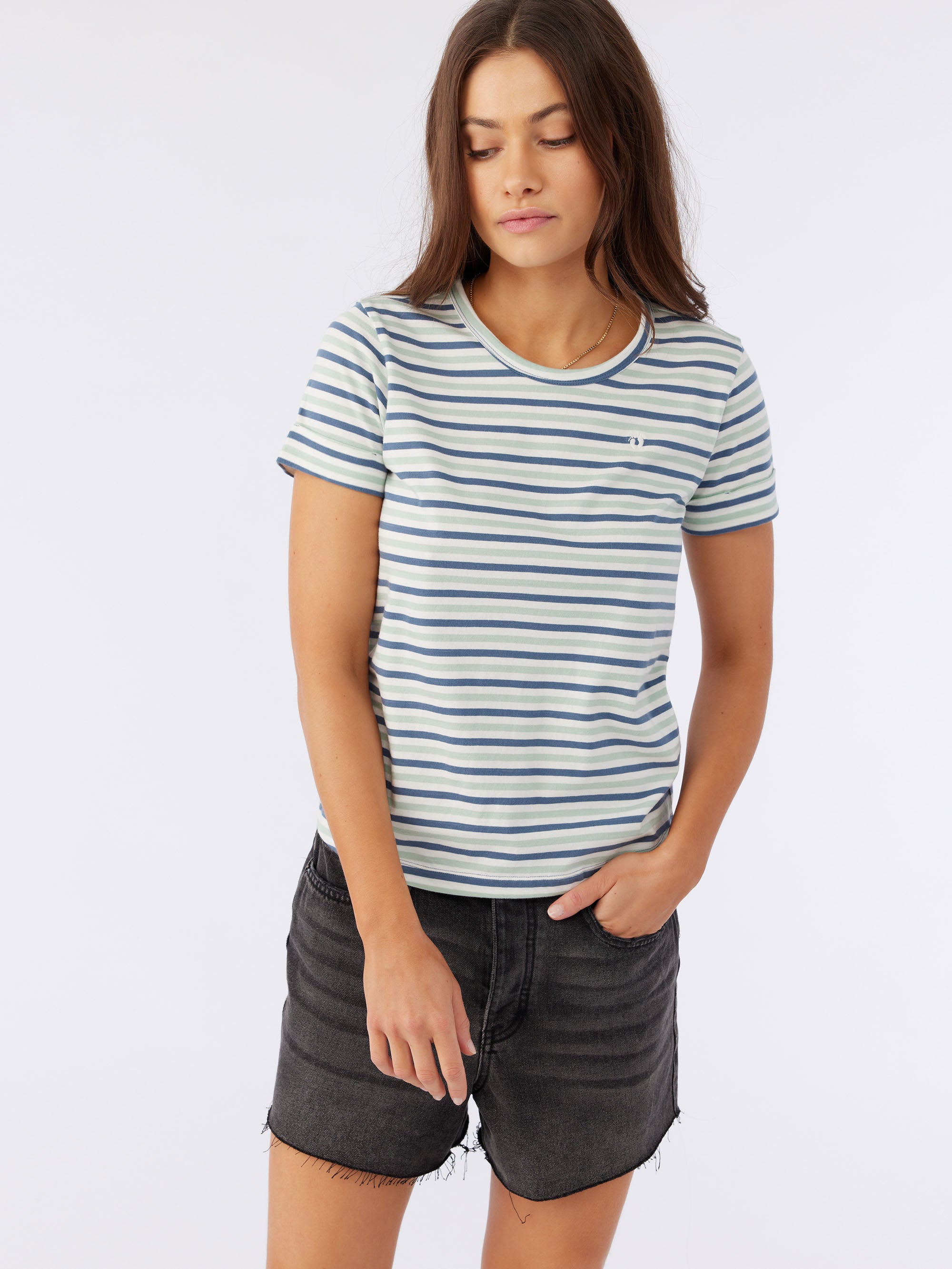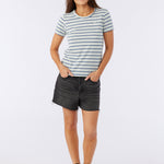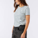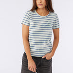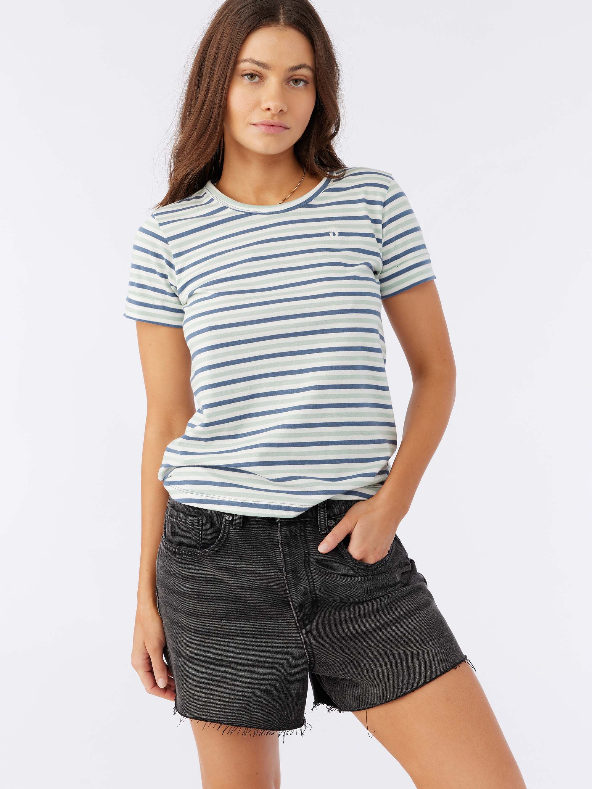 Classic stripes are always in. This is a soft-cotton tee that has a relaxed fit, allover stripe design and hang ten logo detail at the front chest.