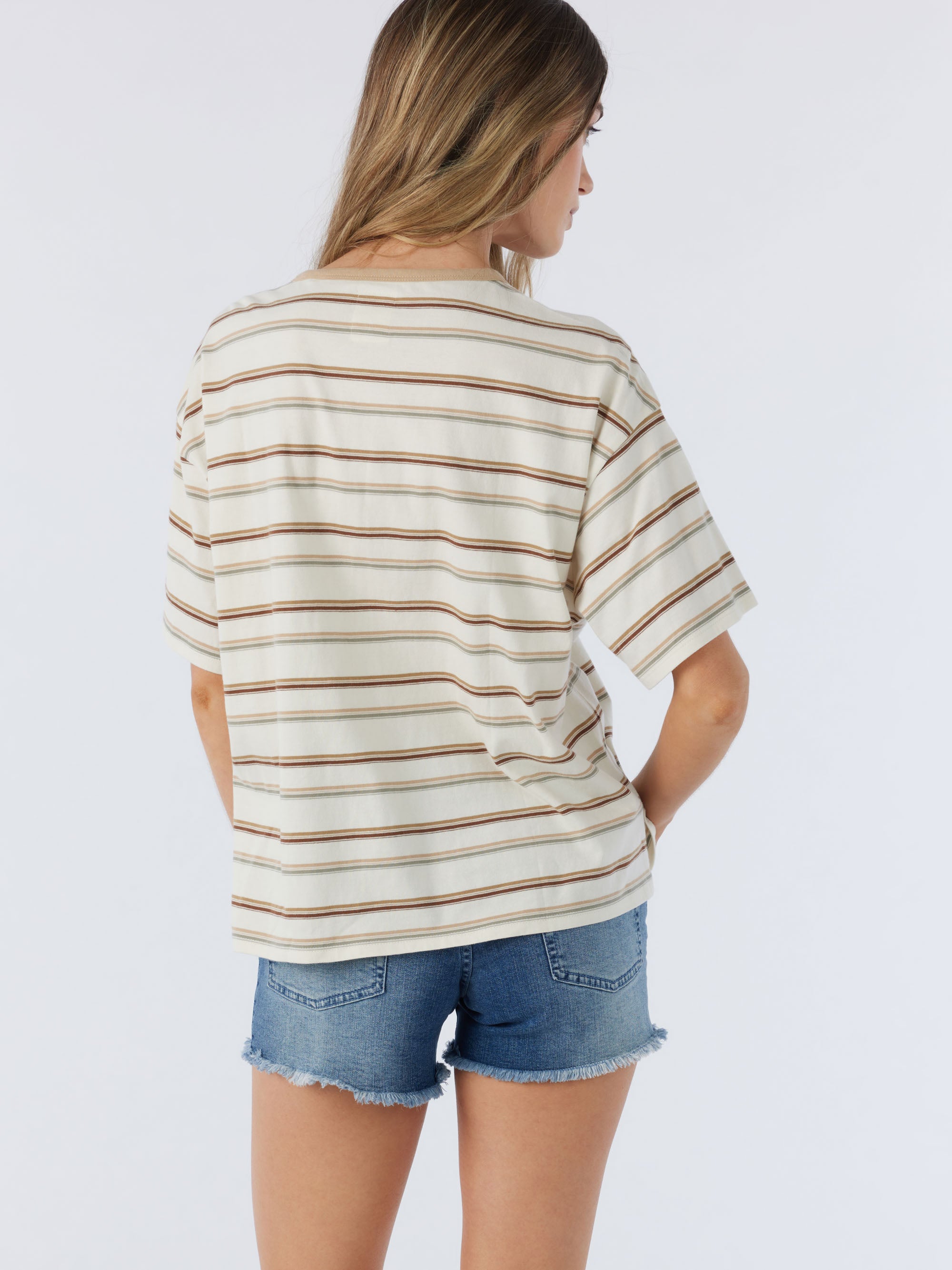 Classic stripes are always in. This is a soft-cotton pocket tee that has a relaxed fit, allover stripe design and hang ten logo detail at the front chest.