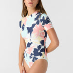 Perfect for swimming, surfing or relaxing on the beach. This one-piece surf suit has a short sleeve design, back zip closure and medium coverage. Stretch fabrication creates a comfortable fit while quick-dry technology speeds up drying time.