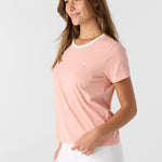 Cute and classic ringer tee that has a premium cotton design, solid color wash and hang ten "feet" embroidery detail at chest.