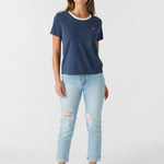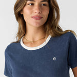 Cute and classic ringer tee that has a premium cotton design, solid color wash and hang ten "feet" embroidery detail at chest.