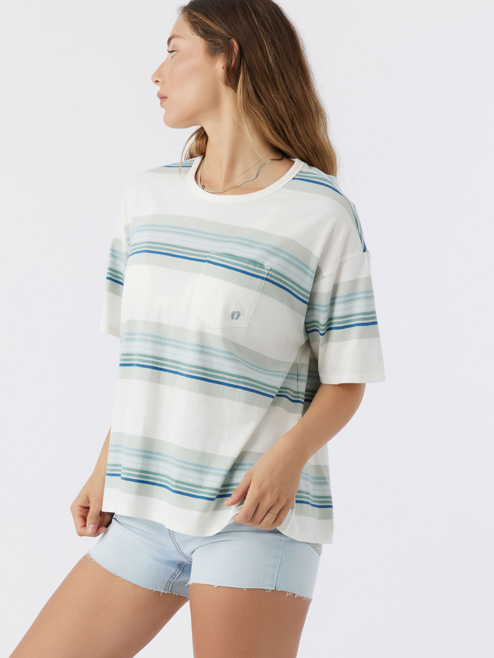Classic stripes are always in. This is a soft-cotton pocket tee that has a relaxed fit, allover stripe design and hang ten logo detail at the front chest.